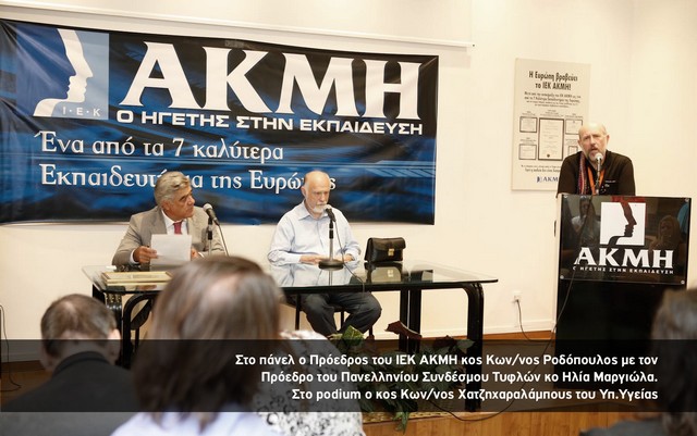 Παρεμβάσεις έγιναν επίσης από τον κο Στρατή Χατζηχαραλάμπους- Κοινωνιολόγο- Δ/νσης Πρωτοβάθμιας Φροντίδας Υγείας του Υπουργείου Υγείας, την ταμία του Πανελληνίου Συνδέσμου Τυφλών και απόφοιτο του Προγράμματος Φυσικοθεραπείας του ΙΕΚ ΑΚΜΗ κα Δώρα Φαρδέλα καθώς και τον Πρόεδρο του Πανελληνίου Συνδέσμου Τυφλών και Αντιπρόεδρο της Εθνικής Ομοσπονδίας Τυφλών κο Ηλία Mαργιόλα ο οποίος δήλωσε χαρακτηριστικά: «όταν το 2005 ο Πρόεδρος του ΙΕΚ ΑΚΜΗ κος Κωνσταντίνος Ροδόπουλος ανακοίνωσε την πρόθεσή του να εντάξει στα προγράμματα σπουδών του, πρόγραμμα εκπαίδευσης για άτομα με προβλήματα όρασης, το κρίναμε όλοι ως πολύ τολμηρό εγχείρημα, ελπίζαμε όμως ενδόμυχα ότι θα ήταν το εφαλτήριο και το κίνητρο και γι’άλλους. Σήμερα, 8 χρόνια μετά, το ΙΕΚ ΑΚΜΗ παραμένει στην Ελλάδα το μόνο Ελληνικό Ιδιωτικό Εκπαιδευτικό Ίδρυμα στην Εκπαίδευση ατόμων με προβλήματα όρασης»