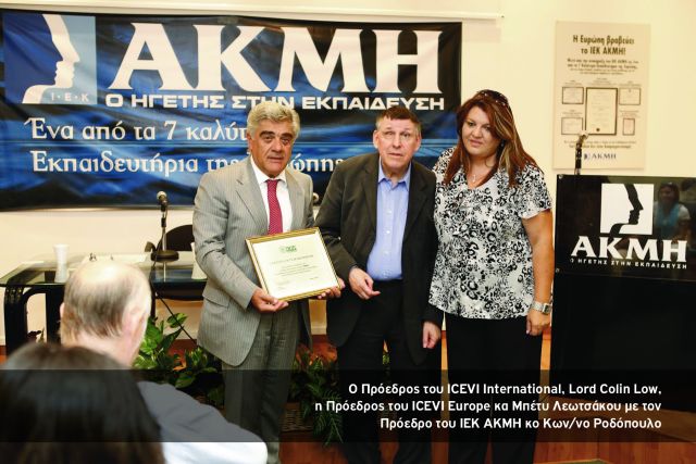 Ο Πρόεδρος του ICEVI International Λόρδος Colin Low, αναφέρθηκε κατά τη διάρκεια της τελετής στο Παγκόσμιο Πρόγραμμα «Εκπαίδευση για όλους» του οποίου ηγείται, με τη συνεργασία της Παγκόσμιας Οργάνωσης Τυφλών (World Blind Union) με διεθνή δράση για την εξασφάλιση ίσων δικαιωμάτων στην εκπαίδευση και εργασία ατόμων με προβλήματα όρασης. Συγχαίροντας το ΙΕΚ ΑΚΜΗ για την εξαίρετη πορεία του όλα αυτά τα χρόνια σε αυτόν τον ευαίσθητο χώρο της εκπαίδευσης, ο Λόρδος επεσήμανε χαρακτηριστικά : «Όταν 6.000.000 παιδιά ηλικίας 0-15 με προβλήματα όρασης έχουν καταγραφεί σε παγκόσμιο επίπεδο και από αυτά το 80% που βρίσκεται στις αναπτυσσόμενες χώρες, δεν λαμβάνει ούτε καν τη βασική εκπαίδευση, στην Ελλάδα έχετε δημιουργήσει τη μέγιστη καινοτομία. Η πρωτοβουλία αυτή του ΙΕΚ ΑΚΜΗ, προσφέρει ανάσα ζωής και διέξοδο σε παιδιά με προβλήματα όρασης για την επαγγελματική τους εξασφάλιση».