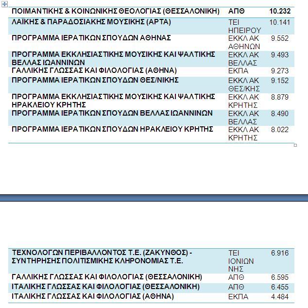 Οι χαμηλότερες βάσεις εισαγωγής σημειώθηκαν σε ξενόγλωσσα τμήματα που έχουν όμως την ιδιομορφία ότι απαιτούν εξέταση σε ειδικό μάθημα και επίτευξη ελάχιστης βαθμολογίας 10. Τα τμήματα αυτά δεν διεκδικούνται από μεγάλο αριθμό υποψηφίων οπότε δεν εξάγονται και ασφαλή συμπεράσματα. Αν παραβλέψουμε τα ξενόγλωσσα τμήματα διαπιστώνουμε ότι η χαμηλότερη βάση εισαγωγής για το 1ο επιστημονικό πεδίο διαμορφώθηκε για τμήμα των ΑΕΙ στα 10.232 μόρια, αφού τόσα απαιτούνταν για την εισαγωγή στο τμήμα Ποιμαντικής και Κοινωνικής Θεολογίας στο Αριστοτέλειο Πανεπιστήμιο. Για τα τμήματα των ΤΕΙ του 1ου πεδίου τη χαμηλότερη βάση την είχε το τμήμα Τεχνολόγων Περιβάλλοντος στη Ζάκυνθο που απαιτούσε για την εισαγωγή 6.916 μόρια. Από εκεί και περά κάτω από τα 10.000 μόρια είχαν αρκετά τμήματα των εκκλησιαστικών ακαδημιών.
