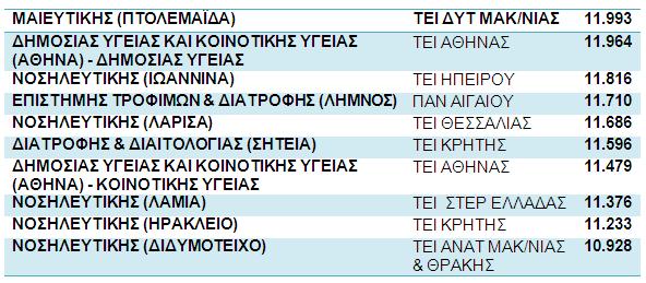 Στα 57 τμήματα του 3ου επιστημονικού πεδίου η χαμηλότερη βάση εισαγωγής για τμήμα των ΑΕΙ διαμορφώθηκε στα 11.710 μόρια καθώς τόσα απαιτούσε το τμήμα Επιστημών Τροφίμων και Διατροφής με έδρα τη Λήμνο. Για τα τμήματα των ΤΕΙ παραδοσιακά τη χαμηλότερη βάση την είχε η Νοσηλευτική των ΤΕΙ Αν.Μακεδονίας -Θράκης με έδρα το ακριτικό Διδυμότειχο.