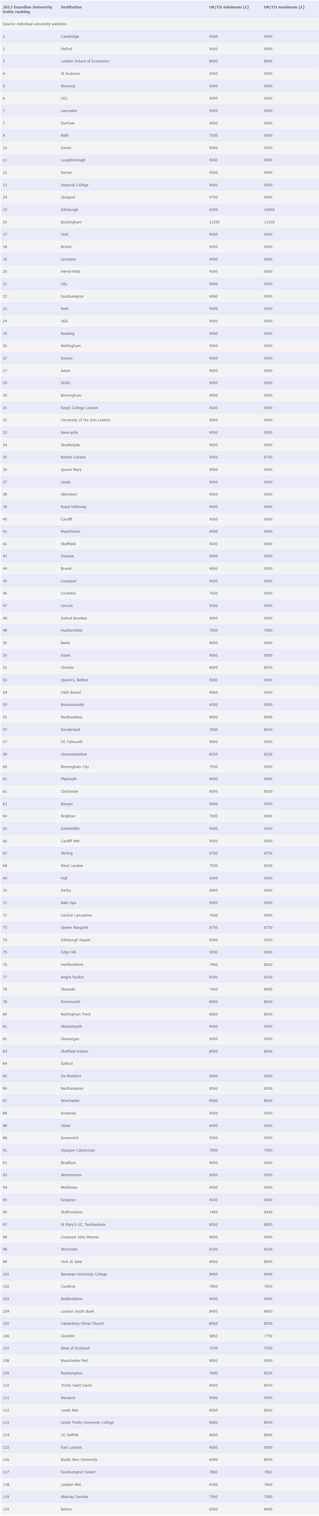 Παρουσιάζουμε αναλυτικό πίνακα που προέρχεται από την εφημερίδα Guardian που παρουσιάζει τα δίδακτρα καθώς και την κατάταξη των πανεπιστημίων στην αξιολόγηση της Guardian…