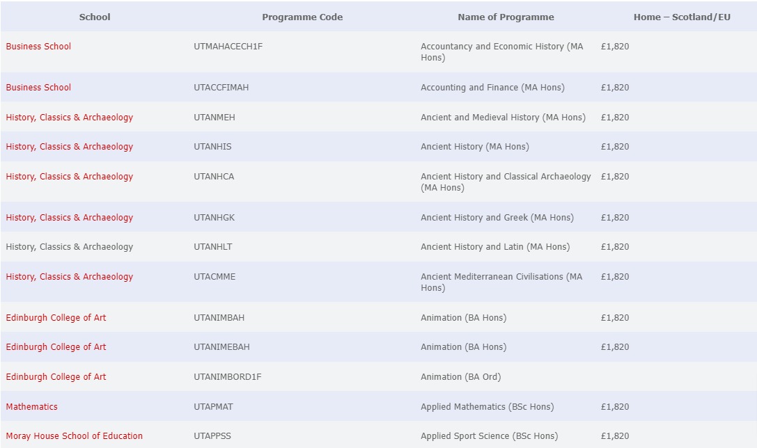 Τα πανεπιστήμια σε Ουαλία και Σκωτία έχουν πιο χαμηλά δίδακτρα συγκριτικά με αυτά της Αγγλίας. Για παράδειγμα λόγω της επιχορήγησης του 80% των διδάκτρων από την τοπική κυβέρνηση της Σκωτίας τα δίδακτρα για τα τμήματα του πανεπιστημίου του Εδιμβούργου είναι 1.820 στερλίνες (2.110 ευρώ).