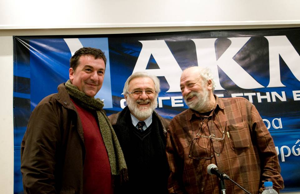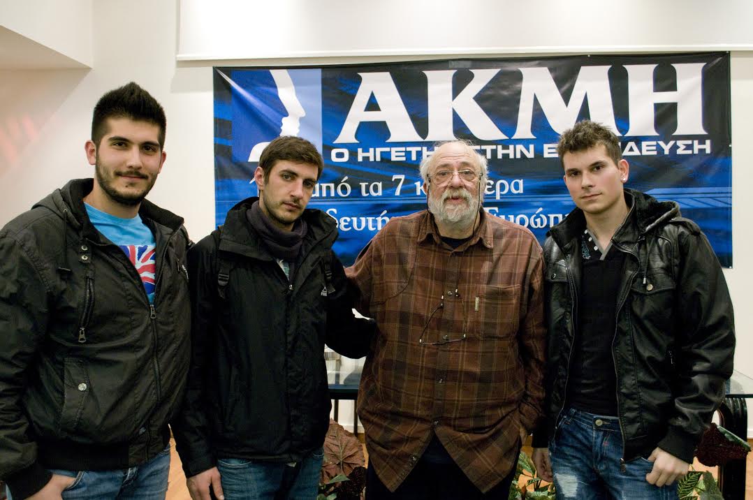 Τον Παντελή Βούλγαρη υποδέχτηκαν οι σκηνοθέτες Γιάννης Σμαραγδής και Ευθύμης Χατζής, συνεργάτες του Ομίλου ΑΚΜΗ.