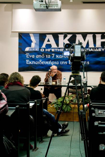 Σε ένα καταιγιστικό master class, ο μεγάλος σκηνοθέτης, εξιστόρησε τη ζωή του, από το πώς επέλεξε να ασχοληθεί με τον κλάδο, πώς ξεκίνησε στη FINOS FILM, πως συνεργάστηκε με μεγάλα ονόματα του χώρου, πως βρίσκει κάθε φορά το θέμα της ταινίας του, πως επιλέγει ηθοποιούς και τι προσέχει στο casting. Παρουσίασε τις δυσκολίες που συναντά ένας κινηματογραφιστής με τα μέσα που προσφέρει αυτή τη στιγμή η ελληνική πραγματικότητα και μετέτρεψε την εμπειρία του σε συμβουλές προς τα νέα παιδιά που θέλουν να ασχοληθούν με τον χώρο.