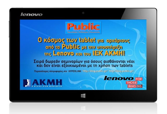 Τα Public σε συνεργασία με ομάδα καθηγητών και σπoυδαστών του τομέα Πληροφορικής και Νέων Τεχνολογιών του ΙΕΚ ΑΚΜΗ διοργανώνουν δωρεάν σεμινάρια στα tablet της Lenovo σε αρχάριους και μη εξοικειωμένους με την τεχνολογία χρήστες.