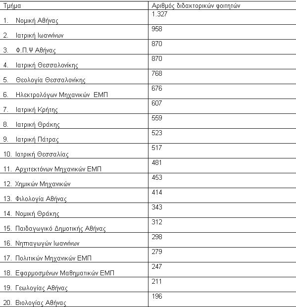 Τα 20 τμήματα με το μεγαλύτερο αριθμό διδακτορικών φοιτητών σε απόλυτα νούμερα
