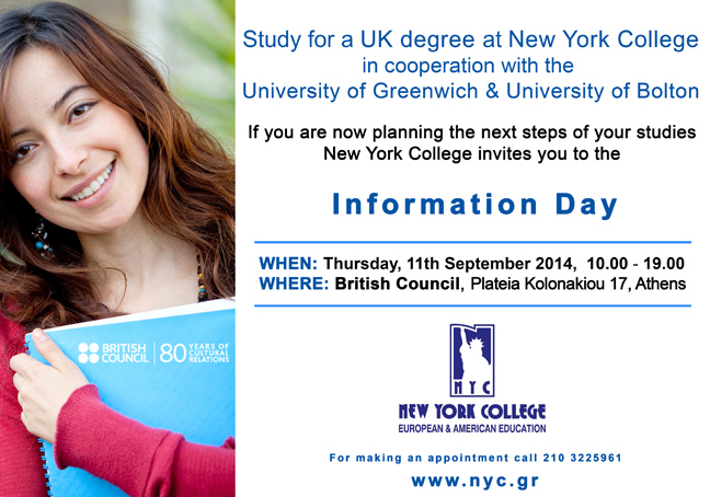 Το New York College σας προσκαλεί στην Ημερίδα που διοργανώνει την Πέμπτη 11 Σεπτεμβρίου από τις 10.00 έως 19.00 στο Βρετανικό Συμβούλιο Αθήνας, (Πλατεία Κολωνακίου 17) με σκοπό την ενημέρωση για τα πτυχία των συνεργαζόμενων βρετανικών πανεπιστημίων με σπουδές εξ’ ολοκλήρου στην Ελλάδα.