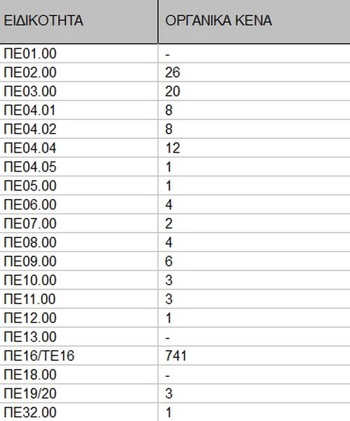 Τέλος τα οργανικά κενά των Γενικών Ειδικοτήτων και των κλάδων ΠΕ16/ΤΕ16 για τις μεταθέσεις σε Μουσικά Σχολεία το 2015 είναι συνολικά 844. Εξ αυτών 103 αφορούν Γενικές Ειδικότητες και 741 κλάδους μουσικών. Η κατανομή τους είναι η ακόλουθη