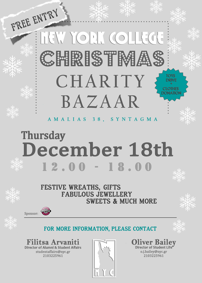 Το Student Affairs Department και το Psychology Club του New York College διοργανώνουν χριστουγεννιάτικο bazaar που θα πραγματοποιηθεί στις 18 Δεκεμβρίου 2014, ημέρα Πέμπτη, 12.00 με 18.00 στις κεντρικές εγκαταστάσεις του Κολλεγίου Αμαλίας 38 στο Σύνταγμα, με σκοπό τη συγκέντρωση πόρων για διαφόρους μη κυβερνητικούς οργανισμούς που βοηθούν κοινωνικές ομάδες που έχουν περιθωριοποιηθεί.