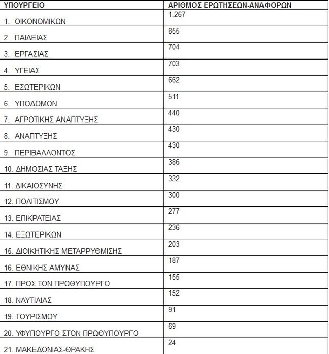 Για το διάστημα από 1η Σεπτεμβρίου έως και 30 Δεκεμβρίου για θέματα του υπουργείου Οικονομικών κατατέθηκαν 1.267 ερωτήσεις ενώ στη δεύτερη θέση βρίσκεται το υπουργείο Παιδείας με 855 ερωτήσεις. 704 και 703 ερωτήσεις αντίστοιχα κατατέθηκαν στα υπουργεία Εργασίας και Υγείας.