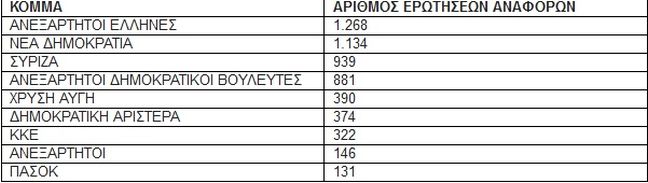 Όσον αφορά το συνολικό αριθμό ερωτήσεων, αναφορών που κατατέθηκαν το τελευταίο τετράμηνο στη Βουλή τα πρωτεία τα έχουν οι Ανεξάρτητοι Έλληνες καθώς έχουν καταθέσει 1.268 ερωτήσεις. Στη 2η θέση είναι η Νέα Δημοκρατία με 1.134 και στην 3η ο ΣΥΡΙΖΑ με 939.