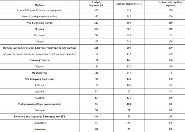 Μέσα από την αντιπαραβολή διαπιστώνει κανείς ότι σε 12 μαθήματα αυξήθηκε ο αριθμός των θεμάτων. Σε κάποια εξ αυτών η αύξηση μπορεί να θεωρηθεί δικαιολογημένη καθώς ο αριθμός των θεμάτων υπολείπονταν του ενδεικτικού αριθμού που είχε παραθέσει το Υπουργείο.