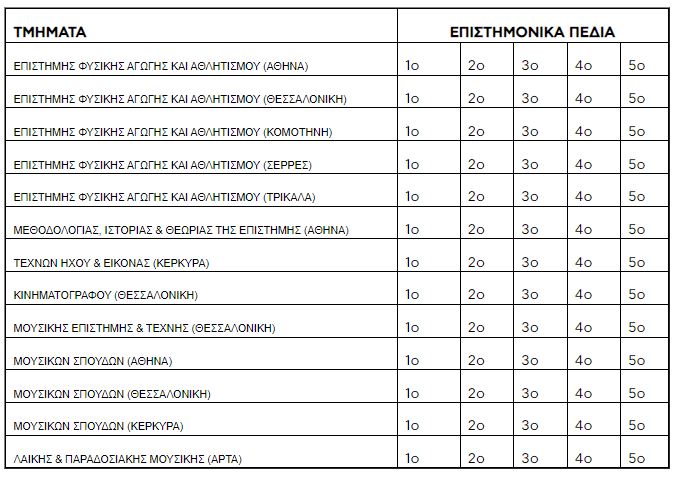 Εκτός όμως από τα πιο πάνω Τμήματα που έχουν ενταχθεί σε όλα τα επιστημονικά πεδία υπάρχουν και άλλα που είναι κοινά για κάποια επιστημονικά πεδία και όχι για το σύνολο αυτών όπως φαίνεται από τον πίνακα που ακολουθεί.