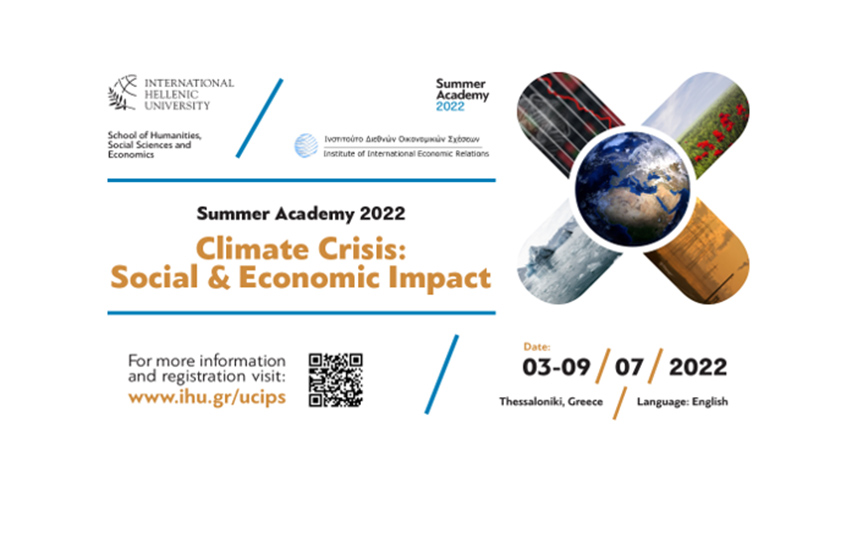 Θερινή ακαδημία με θέμα την Κλιματική Κρίση και τις κοινωνικές αλλά και οικονομικές επιπτώσεις της διοργανώνει τον φετινό Ιούλιο η Σχολή Ανθρωπιστικών, Κοινωνικών και Οικονομικών Επιστημών του Διεθνούς Πανεπιστημίου της Ελλάδος σε συνεργασία με το Ινστιτούτο Διεθνών Οικονομικών Σχέσεων.