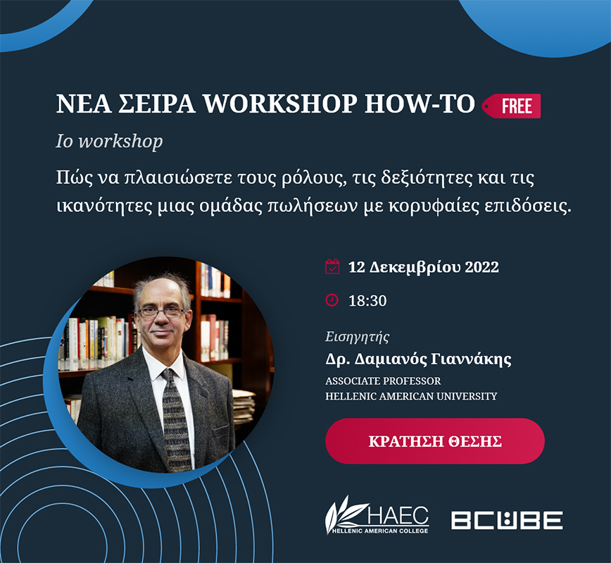 Η πρωτοβουλία B-Cube του Hellenic American College εγκαινιάζει μια νέα σειρά δωρεάν εργαστηρίων σχετικά με τις πιο πρόσφατες τακτικές HOW-TO. Με βάση τις γνώσεις από την επιστήμη και την τεχνολογία, τις επιχειρήσεις και τις ανθρωπιστικές επιστήμες, οι εν λόγω εκδηλώσεις έχουν σχεδιαστεί για να βοηθήσουν τους συμμετέχοντες να εξελιχθούν ως επιτυχημένοι επαγγελματίες και να εντοπίσουν τα προσωπικά τους κίνητρα.