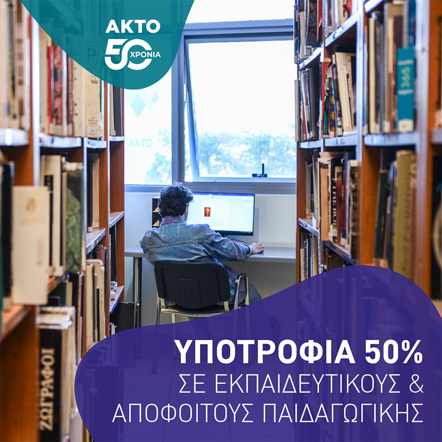 O ΑΚΤΟ προσφέρει 50% Υποτροφία στους εκπαιδευτικούς όλων των βαθμίδων και σε απόφοιτους παιδαγωγικών Σχολών, στο μοναδικό μεταπτυχιακό πρόγραμμα στην Ελλάδα που ειδικεύεται στην Διδακτική των Εικαστικών Τεχνών.