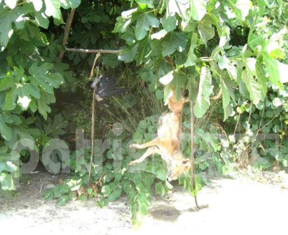 Η εικόνα, που δημοσιεύει το patrisnews.com, εμφανίζει ένα σκυλί και ένα πουλί να είναι κρεμασμένα από τα κλαδιά ενός δέντρου, κάτι που προφανώς αποτελεί αποτέλεσμα της αποτρόπαιης συμπεριφοράς ενός άρρωστου μυαλού.