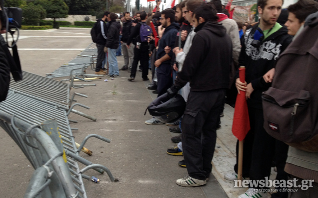 Πριν από λίγα λεπτά οι φοιτητές γκρέμισαν τα κάγκελα που είχαν τοποθετηθεί μπροστά από τη Βουλή στη λεωφόρο Αμαλίας, ενώ άρχισαν να παίρνουν θέση απέναντί τους τα ΜΑΤ.