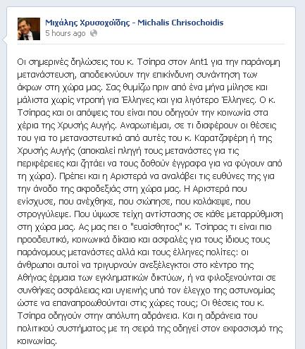 Ότι οδηγεί την κοινωνία «στα χέρια της Χρυσής Αυγής» κατηγορεί τον πρόεδρο του ΣΥΡΙΖΑ Αλέξη Τσίπρα, ο υπουργός Προστασίας του Πολίτη, Μιχάλης Χρυσοχοΐδης, όπως αναφέρει σε σχόλιο που ανάρτησε στο Facebook, με αφορμή δηλώσεις του πρώτου για την παράνομη μετανάστευση.