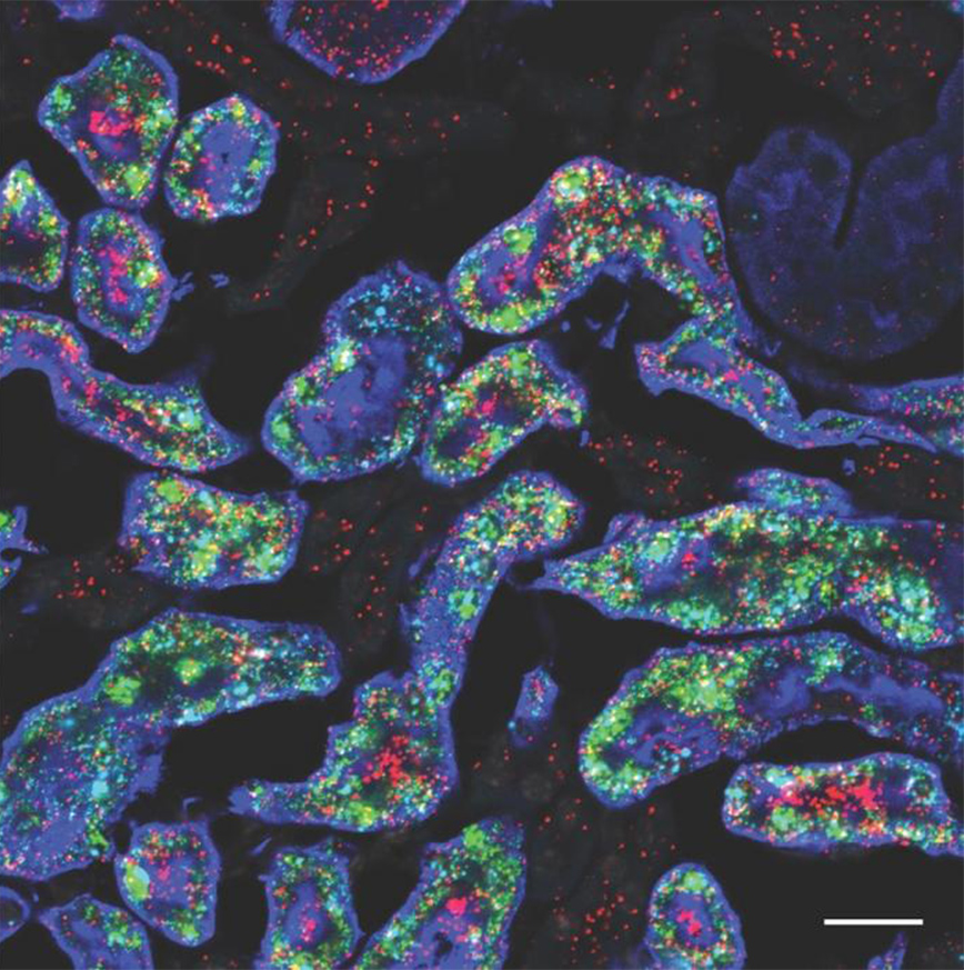 Φωτο: Δύο από τα γονίδια (με κόκκινο και πράσινο) που είναι πιο ενεργά στους νεφρούς θηλυκών ποντικών (μπλε):