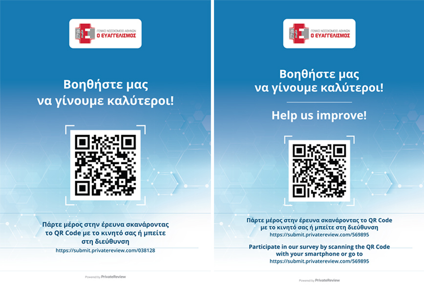- QRCode σε καρτολίνα (αφισέτες Plexiglas) αναρτημένα σε στους εσωτερικούς χώρους των Κλινικών Τμημάτων όπου νοσηλεύονται οι ασθενείς. Κατά τη διάρκεια της νοσηλείας του, ο ασθενής ή/και ο συνοδός του, μπορούν να σκανάρουν το QRCode που έχει τοποθετηθεί σε εμφανές σημείο στους χώρους των Κλινικών Τμημάτων και να αξιολογήσει την εμπειρία του απαντώντας σε ένα λεπτομερές ερωτηματολόγιο.