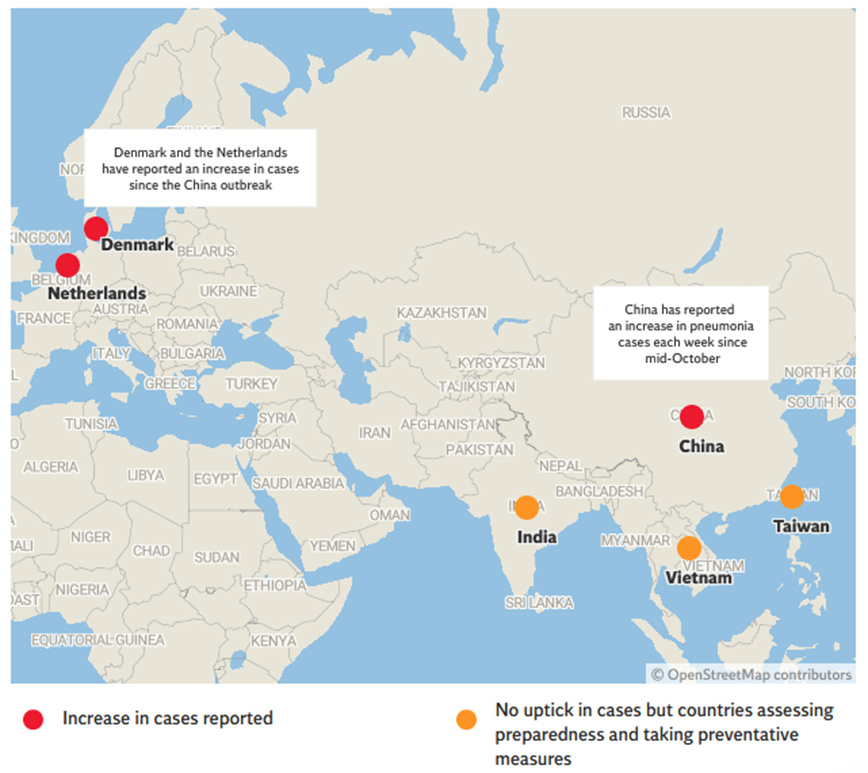 Τα κρούσματα πνευμονίας σε παιδιά αυξάνονται στην Ευρώπη, καθώς η Κίνα αντιμετωπίζει μια άνευ προηγουμένου έξαρση αναπνευστικών ασθενειών. Η Ολλανδία και η Δανία έχουν αναφέρει έξαρση των κρουσμάτων, ενώ η Ινδία, η Ταϊβάν και το Βιετνάμ έχουν αρχίσει να λαμβάνουν προληπτικά μέτρα, για να προετοιμάσουν τα συστήματα υγειονομικής περίθαλψης.
