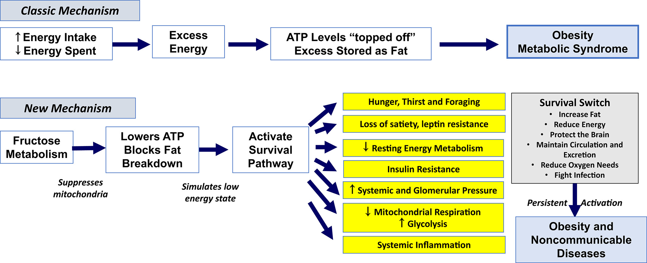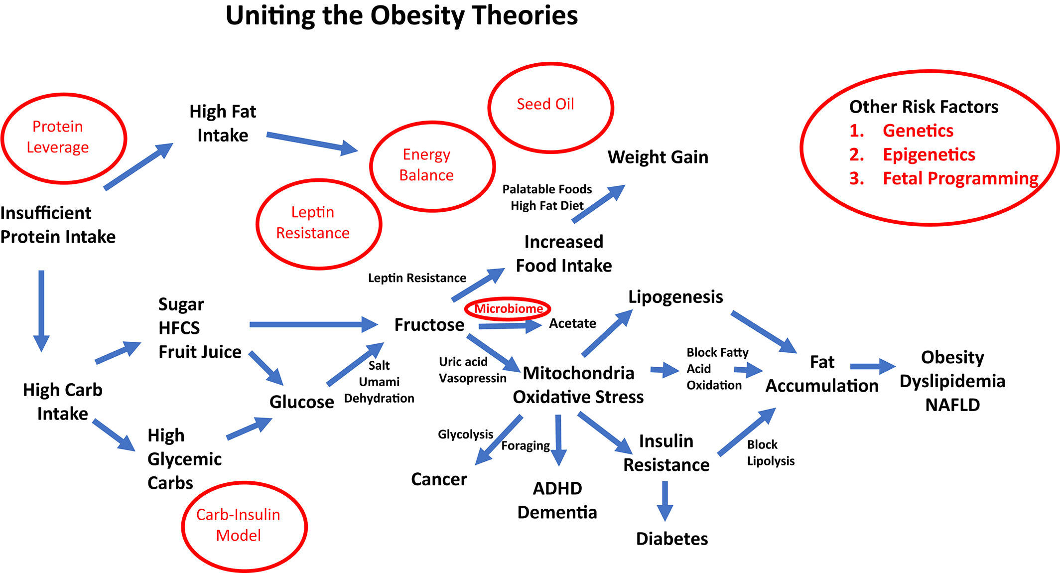 Παρόλο που αναγνωρίζουμε την ανάγκη μείωσης υπερ-επεξεργασμένων φαγητών, δεν έχει ξεκαθαριστεί αν πρέπει να επικεντρωθούμε στη μείωση της ζάχαρης, στους υδατάνθρακες, στα ακόρεστα λιπαρά ή απλά να αυξήσουμε την πρωτεΐνη. Σε αυτήν τη μελέτη ελέγχουμε όλες τις διατροφικές υποθέσεις για την παχυσαρκία. Προτείνουμε πως όλες οι υποθέσεις έχουν δίκιο και ενώ εκ πρώτης όψεως φαίνονται ασύμβατες, μπορούν όλες να ενοποιηθούν αν βασιστούν σε μία άλλη υπόθεση, γνωστή ως η επιβίωση της φρουκτόζης.