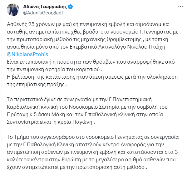 Την είδηση γνωστοποίησε ο υπουργός Υγείας, Άδωνις Γεωργιάδης, με ανάρτησή του στο «Χ».