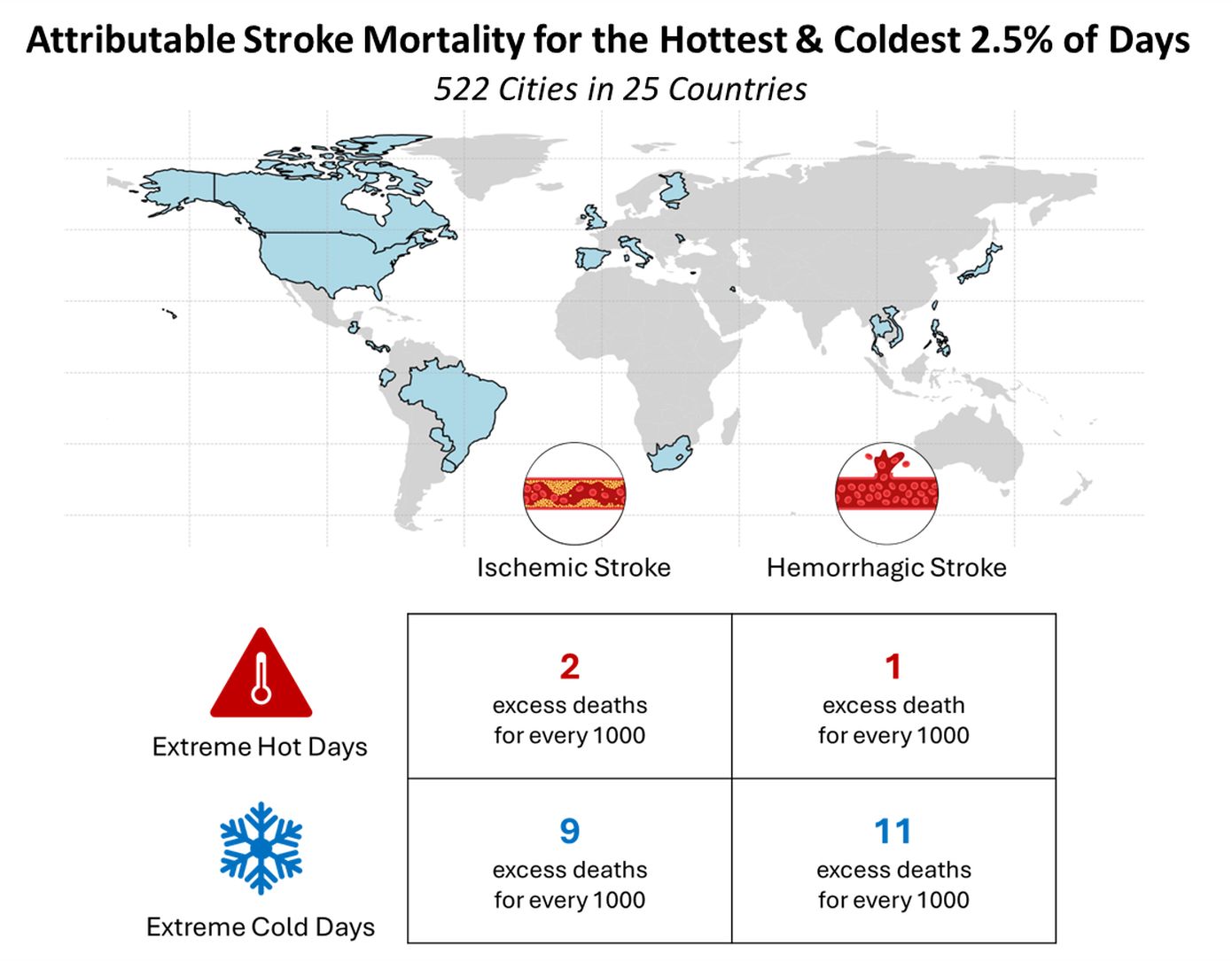 Η ερευνητική ομάδα εντόπισε λοιπόν ότι σε κάθε 1.000 θανάτους από ισχαιμικό ή αιμορραγικό εγκεφαλικό επεισόδιο, το 2,5% των ημερών με ακραίες θερμοκρασίες κατά την περίοδο αυτή που μελετήθηκε, συνέβαλε σε 9,1 επιπλέον θανάτους λόγω κρύου και 2,2 θανάτους λόγω ζέστης.