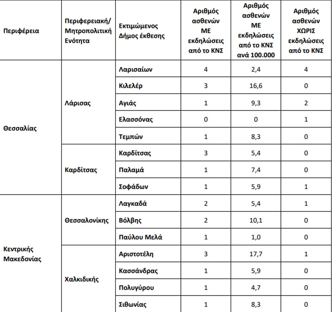 Δήμος Καρδίτσας 3 κρούσματα (όλα με εκδηλώσεις από το ΚΝΣ)