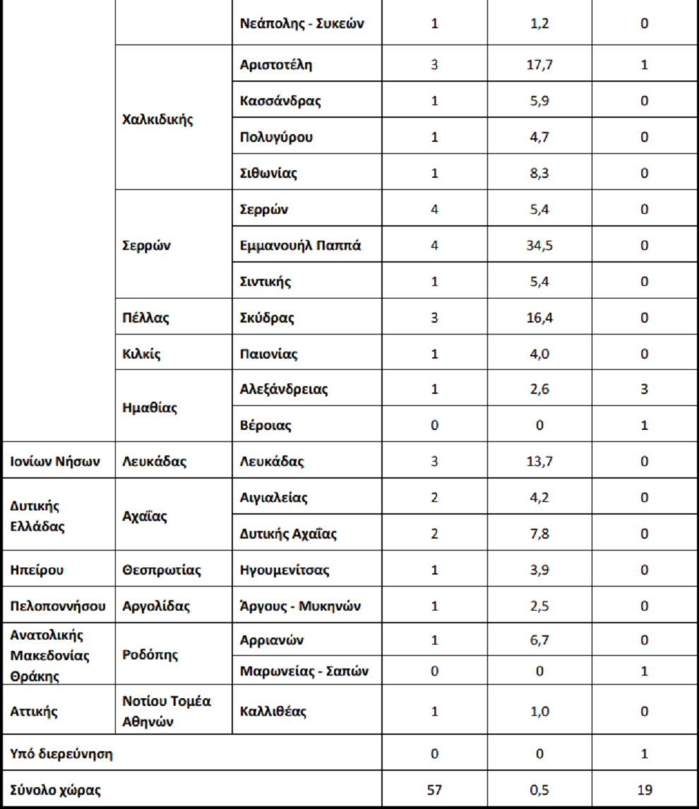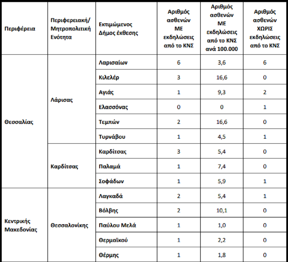 Πίνακας με τις περιοχές που εντοπίστηκαν τα κρούσματα: