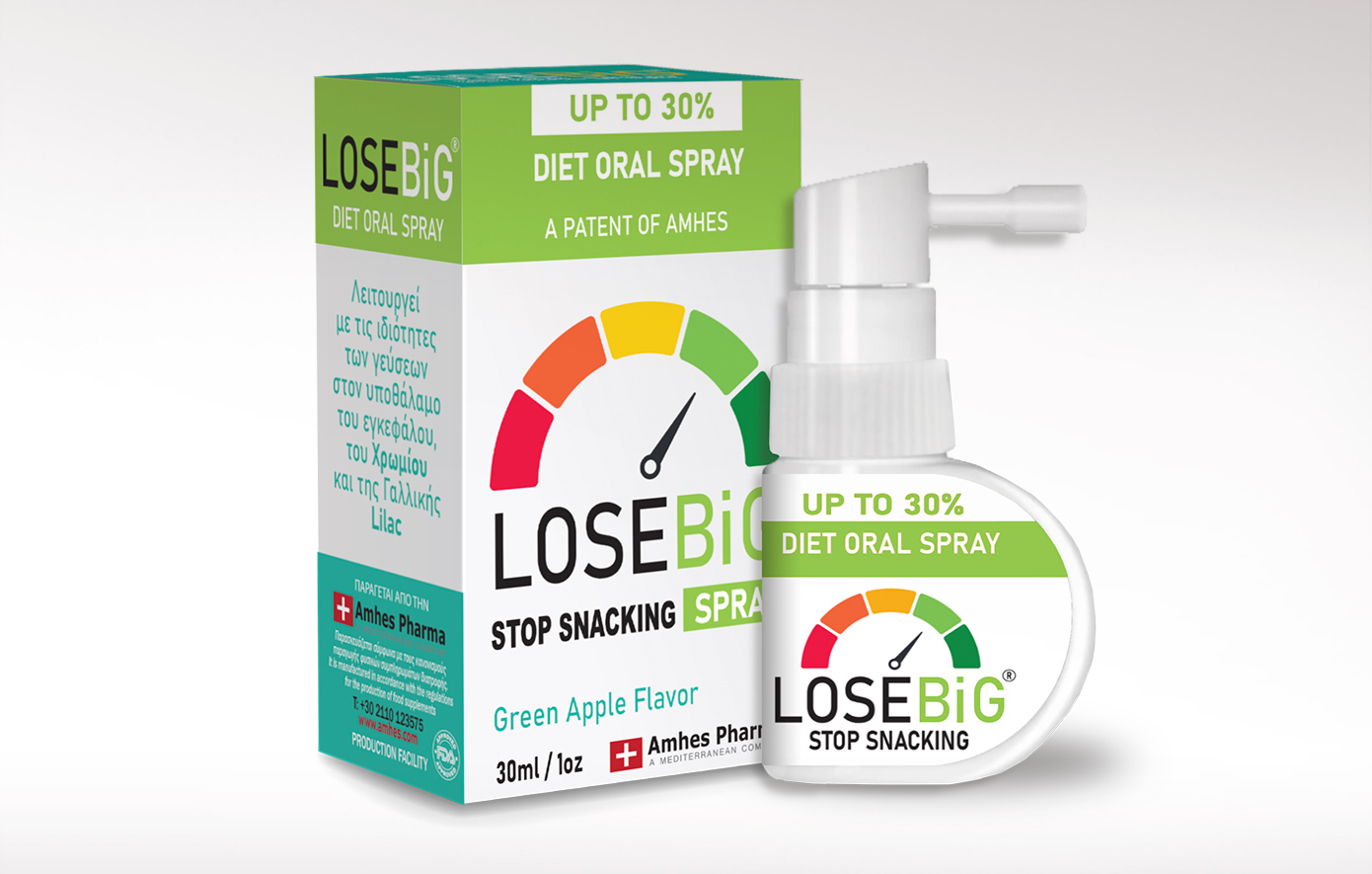 Το LOSEBIG SPRAY, αυτή η παγκόσμια καινοτομία της Amhes Pharma, όπως εξηγεί ο ίδιος, έχει σχεδιαστεί να λειτουργεί και να δημιουργεί το effect – stop snacking™ με την δύναμη των μελετημένων γεύσεων και των πολυφαινολών τους, του χρωμίου, της φαινόλης MHCP που περιέχει το εκχύλισμα κανέλλας και του μοναδικού French Lilac Extract, δηλαδή της Γαλλικής Πασχαλιάς και πηγή της θαυματουργής μετφορμίνης που ισορροπεί τα επίπεδα της γλυκόζης στο αίμα .