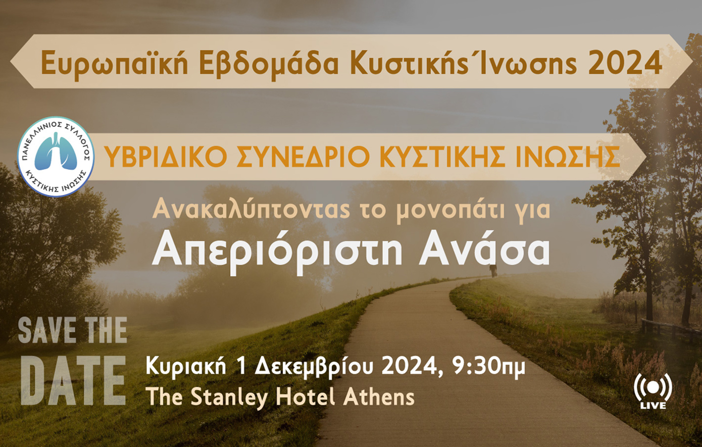 Στο πλαίσιο της Ευρωπαϊκής Εβδομάδας Κυστικής Ίνωσης, ο Πανελλήνιος Σύλλογος Κυστικής Ίνωσης διοργανώνει το ετήσιο Yβριδικό Συνέδριο, με τίτλο: “Ανακαλύπτοντας το Μονοπάτι για Απεριόριστη Ανάσα”, με ομιλητές καταξιωμένους επιστήμονες και επαγγελματίες υγείας που θα ενημερώσουν για την Κυστική Ίνωση και τη μεταμόσχευση πνευμόνων. Το συνέδριο θα πραγματοποιηθεί την Κυριακή 1η Δεκεμβρίου 2024, στις 9:30 π.μ., στο The Stanley Hotel Athens, με δυνατότητα παρακολούθησης και μέσω live streaming σε ελληνικά και αγγλικά.