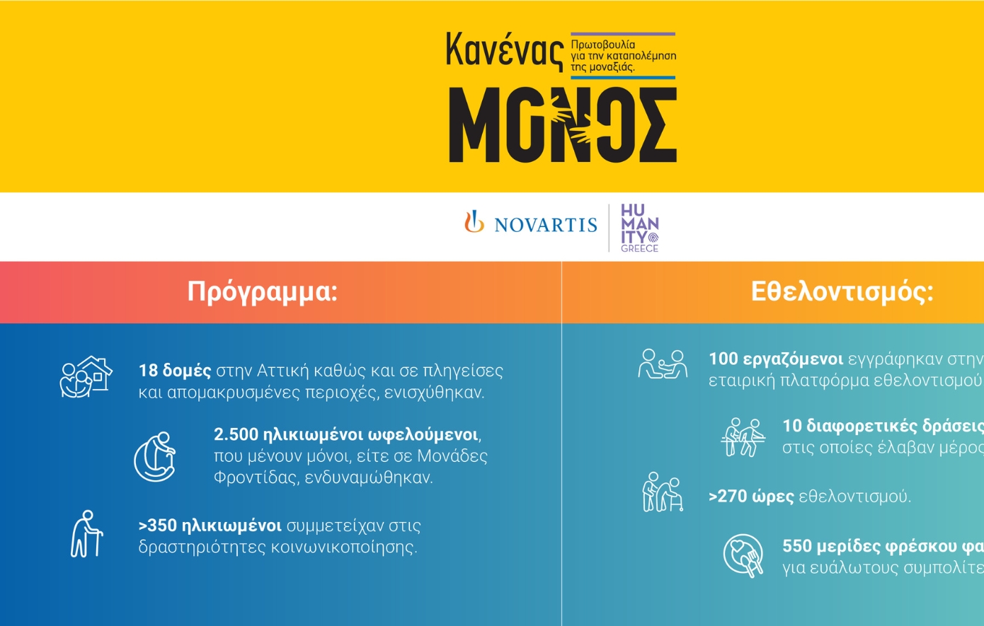 Η πρωτοβουλία εταιρικής υπευθυνότητας της Novartis Hellas, «Κανένας Μόνος», ενίσχυσε την ψυχική υγεία και βελτίωσε την ποιότητα ζωής των ηλικιωμένων από την αρχή του 2024. Με την υποστήριξη του Humanity Greece, το πρόγραμμα τόνωσε το αίσθημα κοινωνικής αλληλεγγύης και ανέδειξε το ζήτημα της μοναξιάς στην Τρίτη Ηλικία, επιβεβαιώνοντας τον ανθρωποκεντρικό προσανατολισμό και την αποστολή της εταιρείας, να βοηθάει τους ανθρώπους να ζουν περισσότερο και καλύτερα.
