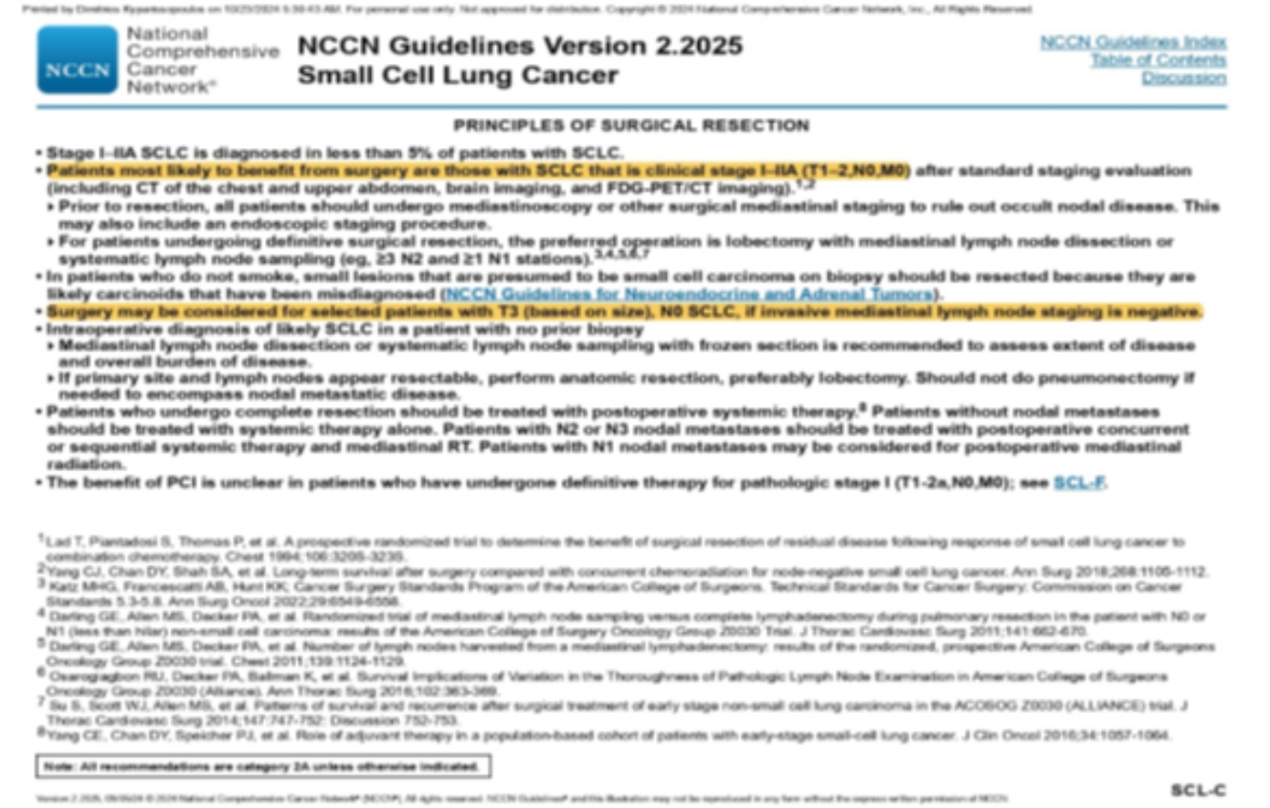 Σαν καθηγητής ρομποτικής χειρουργικής αλλά και σαν ένας χειρουργός θώρακα που πραγματοποιεί όλη την γκάμα των επεμβάσεων είναι σαφές ότι εφόσον δεν υπάρχει ανατομικό πρόβλημα προκρίνω την ρομποτική επέμβαση για τους ασθενείς μου. Αυτό δεν είναι δική μου άποψη αλλά επίσης διεθνής κατευθυντήρια οδηγία (NCCN Guidelines) (εικόνα 6) που προτρέπουν τους χειρουργούς να χειρουργούνε μόνο με ελάχιστα επεμβατικό τρόπο, δηλαδή θωρακοσκοπικά ή ρομποτικά, καθώς έχει αποδειχθεί ότι οι ασθενείς που χειρουργούνται με αυτόν τον τρόπο έχουν καλύτερη πρόγνωση.