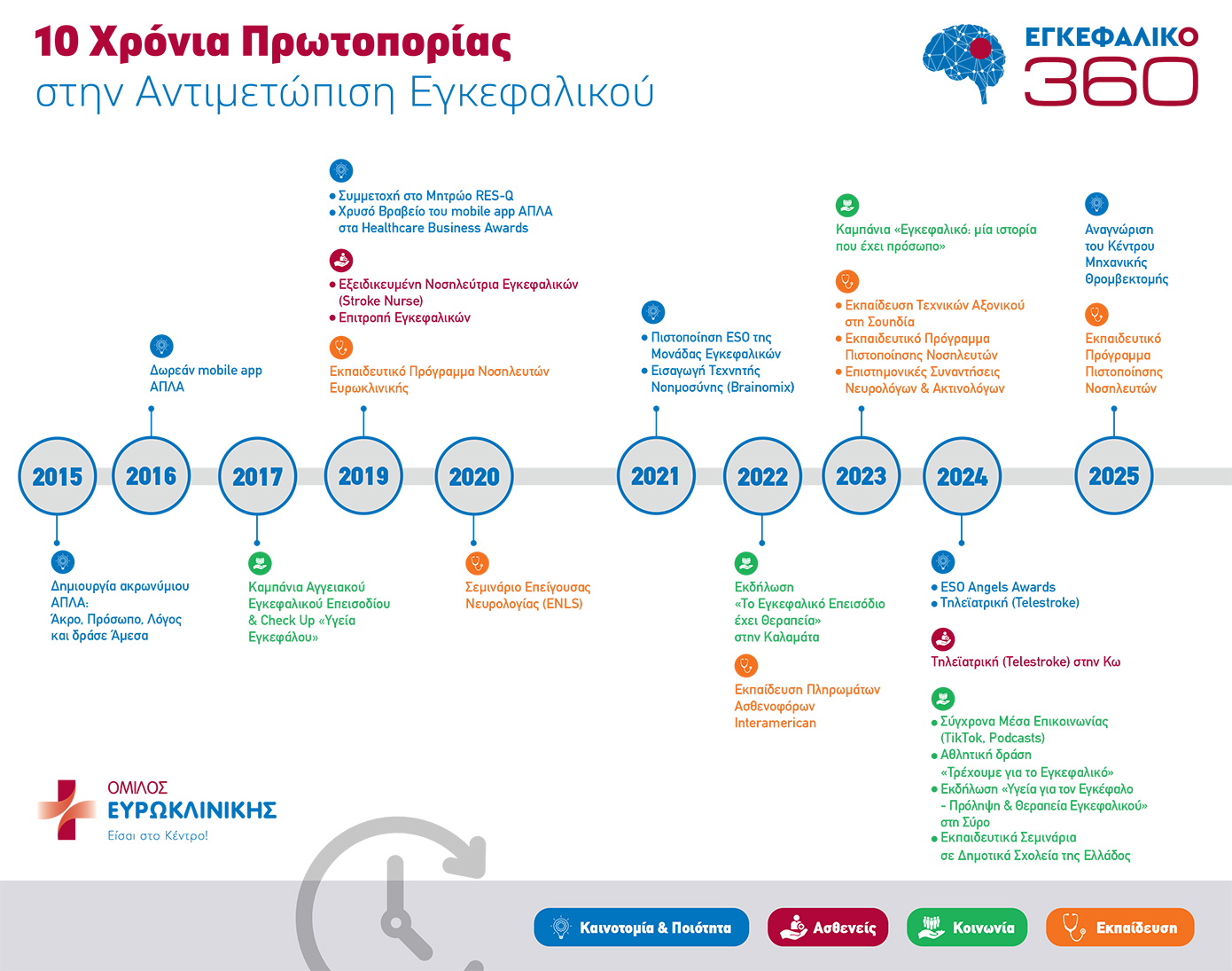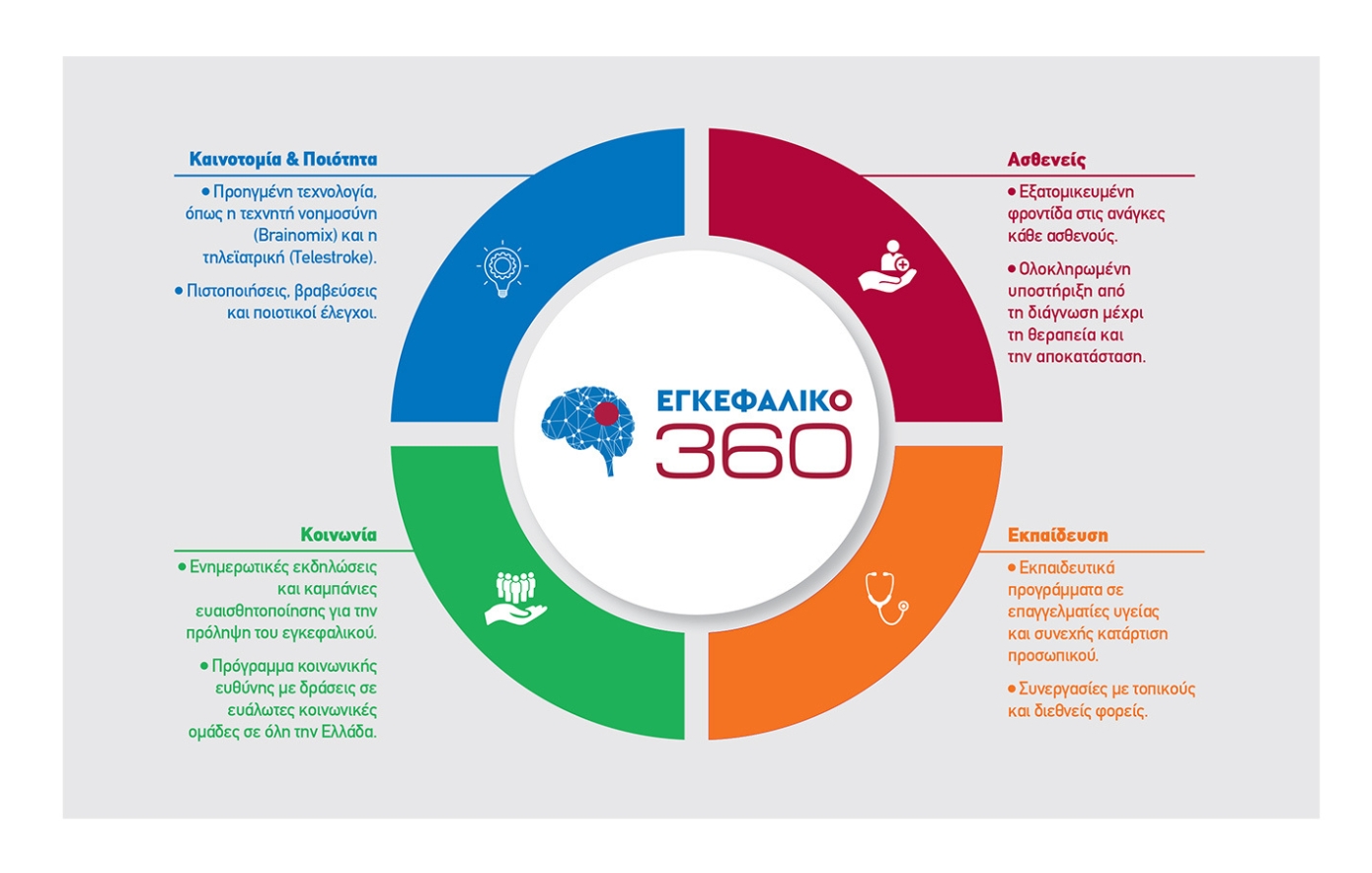 Από το 2015 έως και σήμερα, το πρόγραμμα Εγκεφαλικό 360° αποτελεί ένα πρωτοποριακό, συνεχές και ολοκληρωμένο πρόγραμμα δράσεων με στόχο την πρόληψη, ευαισθητοποίηση, έγκαιρη διάγνωση και άμεση αντιμετώπιση των Αγγειακών Εγκεφαλικών Επεισοδίων (ΑΕΕ).