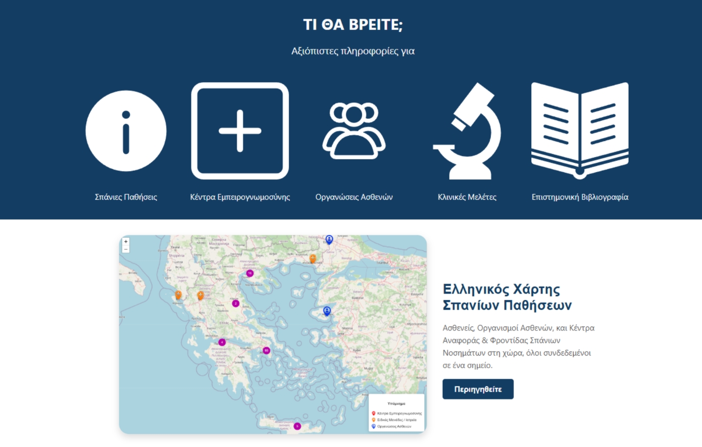 - Αναζήτησης πληροφοριών για πάνω από 500 καταγεγραμμένα σπάνια νοσήματα στη χώρα μας,