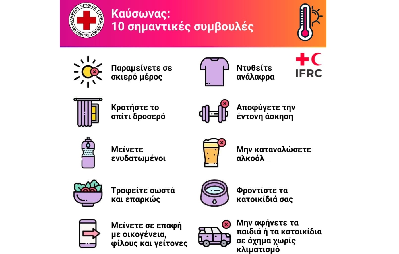 Με τον υδράργυρο να χτυπάει κόκκινο αυτές τις μέρες και το κύμα καύσωνα να είναι αισθητό σε όλες τις περιοχές της Ελλάδας, ο Ελληνικός Ερυθρός Σταυρός (Ε.Ε.Σ), προτείνει 10 απλές οδηγίες για προστασία από τις υψηλές θερμοκρασίες, οι οποίες μπορούν να προκαλέσουν σοβαρά προβλήματα υγείας, ιδιαίτερα σε ομάδες υψηλού κινδύνου όπως ηλικιωμένοι και παιδιά.