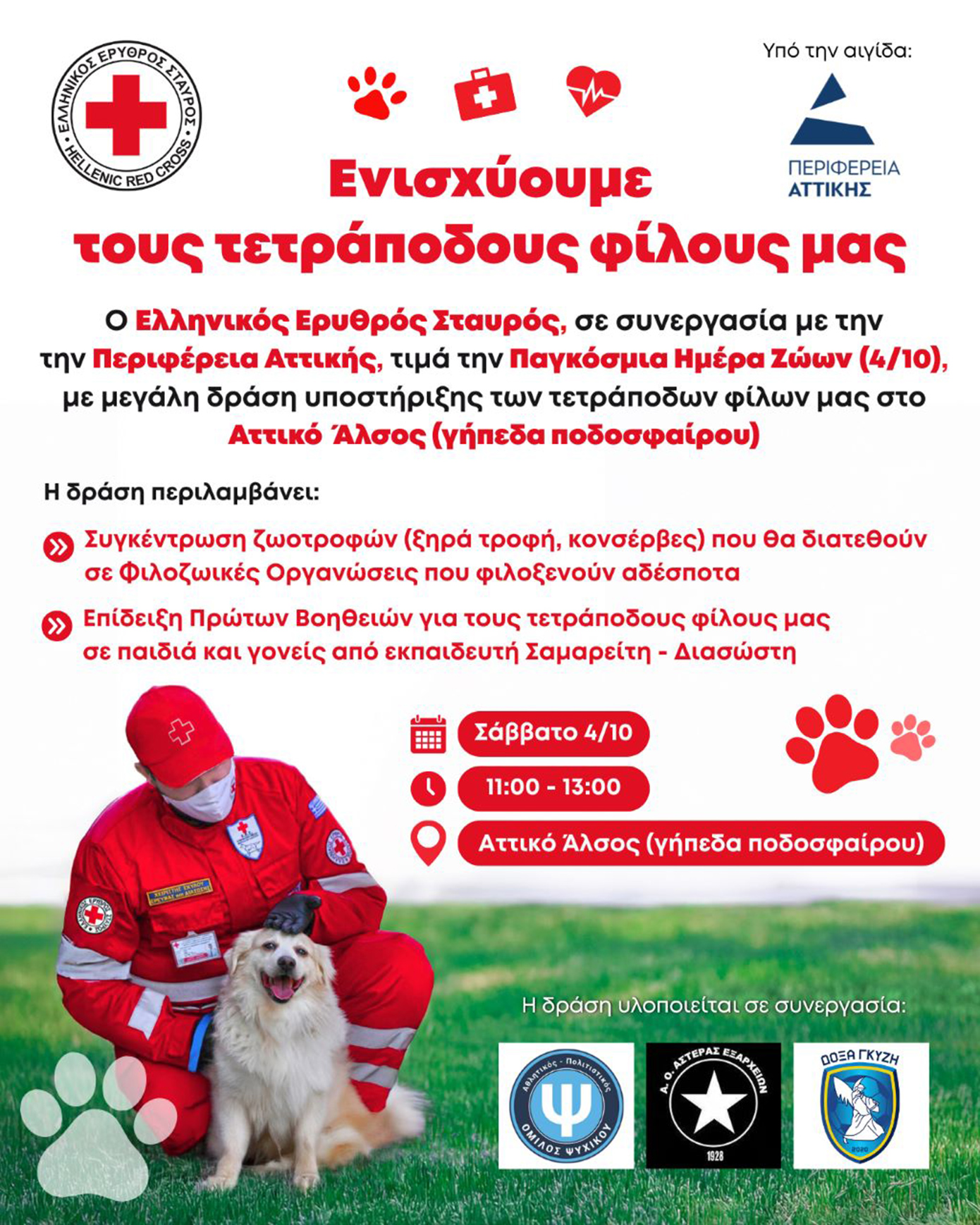 Ο Ελληνικός Ερυθρός Σταυρός (Ε.Ε.Σ.), με αφορμή την Παγκόσμια Ημέρα Ζώων (4/10), διοργανώνει μεγάλη δράση υποστήριξης των τετράποδων φίλων μας, το Σάββατο (4/10), στο Αττικό Άλσος (γήπεδα ποδοσφαίρου), από τις 11:00 έως τις 13:00. Η δράση τελεί υπό την αιγίδα της Περιφέρειας Αττικής.