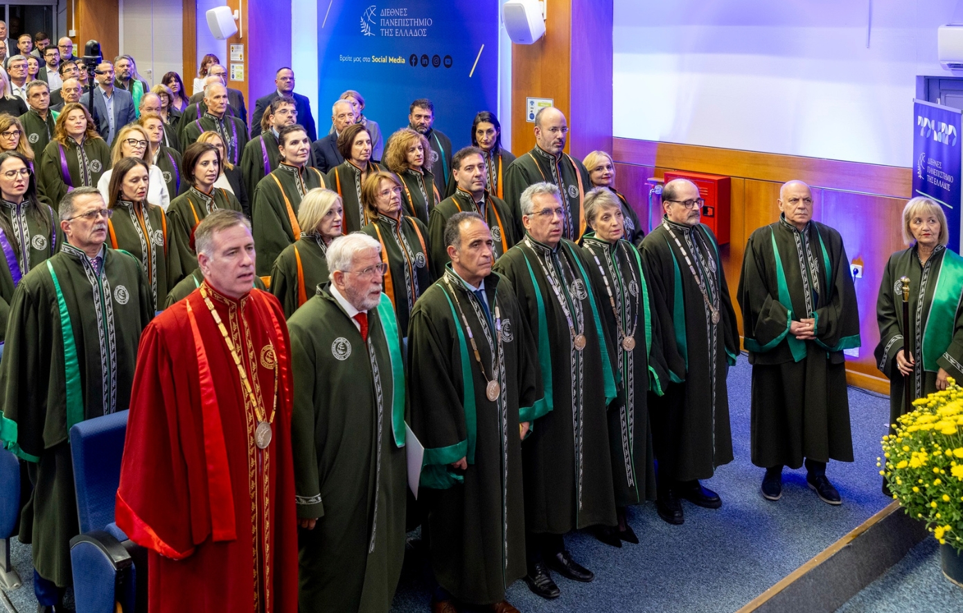 Στο κατάμεστο Αμφιθέατρο ο Πρύτανης του Διεθνούς Πανεπιστημίου της Ελλάδος, Καθηγητής Σταμάτης Αγγελόπουλος ανέφερε, μεταξύ άλλων στην ομιλία του «κύριε Πρόεδρε, η σημερινή αναγόρευση αποκτά ξεχωριστή σημασία, διότι ο δικός σας αγώνας για την υγειονομική αριστεία και την τεχνολογική καινοτομία βρίσκει άμεση ανταπόκριση στις βασικές αξίες του Διεθνούς Πανεπιστημίου της Ελλάδος. Το ΔΙΠΑΕ, ως ένα από τα μεγαλύτερα Πανεπιστήμια της χώρας, έχει ενσωματώσει την καινοτομία στον πυρήνα της αποστολής του. Η έμφαση στην έρευνα αιχμής και η διαρκής αναβάθμιση των προγραμμάτων σπουδών μας, αποσκοπούν στη δημιουργία αποφοίτων ικανών να πρωταγωνιστήσουν στο σύγχρονο, απαιτητικό περιβάλλον της υγείας. Οι φοιτητές μας, με γνώση και υψηλή κατάρτιση, αποτελούν τη ζωτική δύναμη που τροφοδοτεί κορυφαίες δομές όπως και ο Όμιλος Ιατρικού Αθηνών. Η επιλογή μας να σας τιμήσουμε αναδεικνύει ακριβώς αυτή τη σύγκλιση στόχων: τη δέσμευση του Πανεπιστημίου στην παραγωγή γνώσης και τη δική σας δέσμευση στην πρακτική εφαρμογή της, με στόχο την αναβάθμιση της ζωής του πολίτη».