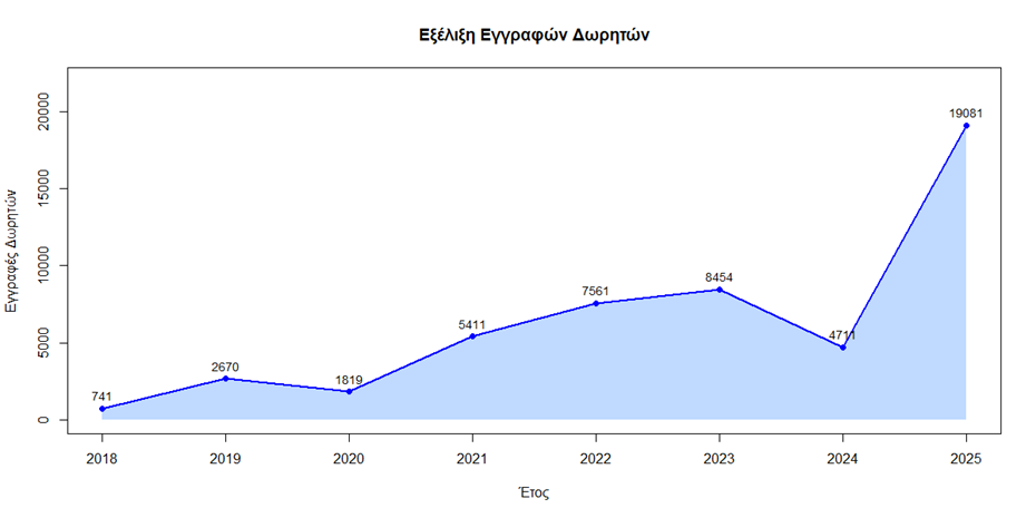 - Το Εθνικό Μητρώο Δωρητών Οργάνων, από το τέλος του 2018 που συστάθηκε (N.4512/2018) μέχρι μία ημέρα πριν την έναρξη της ενημέρωσης από την ΗΔΙΚΑ, αριθμούσε 35.000 εγγεγραμμένους Δωρητές Οργάνων. Σήμερα, με την ως άνω δράση, αριθμεί 50.000 Δωρητές, αύξηση της τάξεως του 42% μέσα σε 10 μόλις ημέρες.