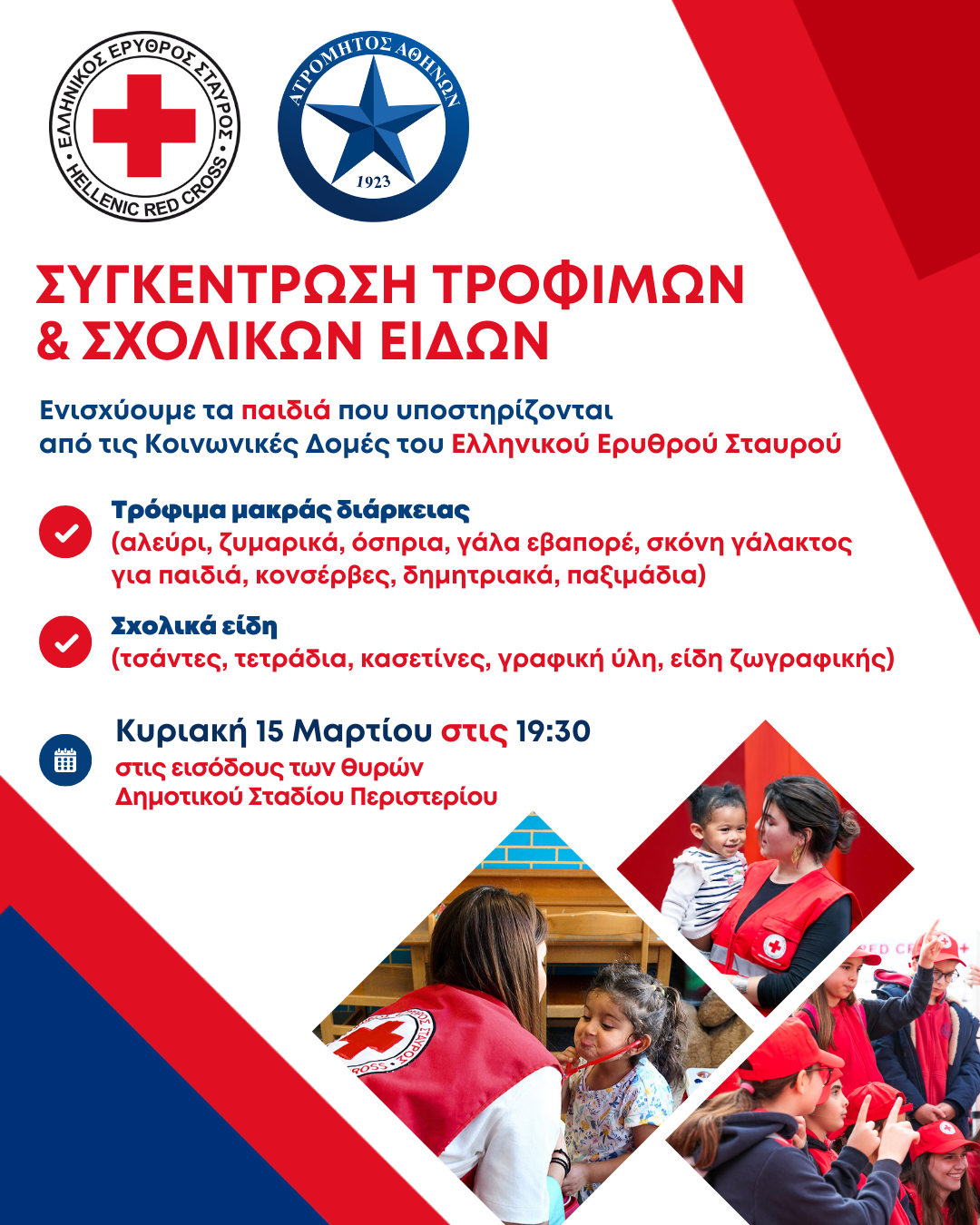 Ο Ελληνικός Ερυθρός Σταυρός (Ε.Ε.Σ.) και η ΠΑΕ Ατρόμητος, με αφορμή την Παγκόσμια Ημέρα κατά του σχολικού εκφοβισμού (bullying), διοργανώνουν μεγάλη δράση ενημέρωσης και ευαισθητοποίησης για ένα τόσο σοβαρό κοινωνικό ζήτημα αλλά και αλληλεγγύης για τα 213 παιδιά που υποστηρίζονται από τις κοινωνικές δομές του Ε.Ε.Σ., στον αγώνα του Ατρομήτου με την ΑΕΚ, την Κυριακή 15 Μαρτίου 2026 και ώρα 19:30 στο Δημοτικό Στάδιο Περιστερίου.