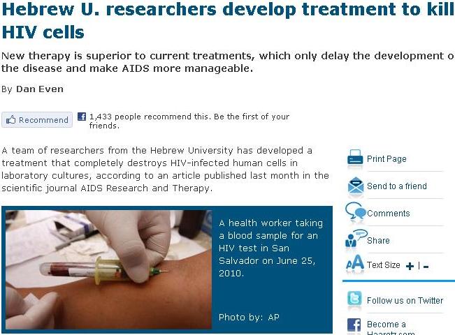 Σύμφωνα με δημοσίευμα της εφημερίδα Haaretz ισραηλινοί ερευνητές ανέπτυξαν νέα αγωγή κατά του ιού HIV, που εξουδετερώνει τα μολυσμένα από τον ιό ανθρώπινα κύτταρα και θα μπορούσε να οδηγήσει σε επανάσταση στην αγωγή του AIDS.