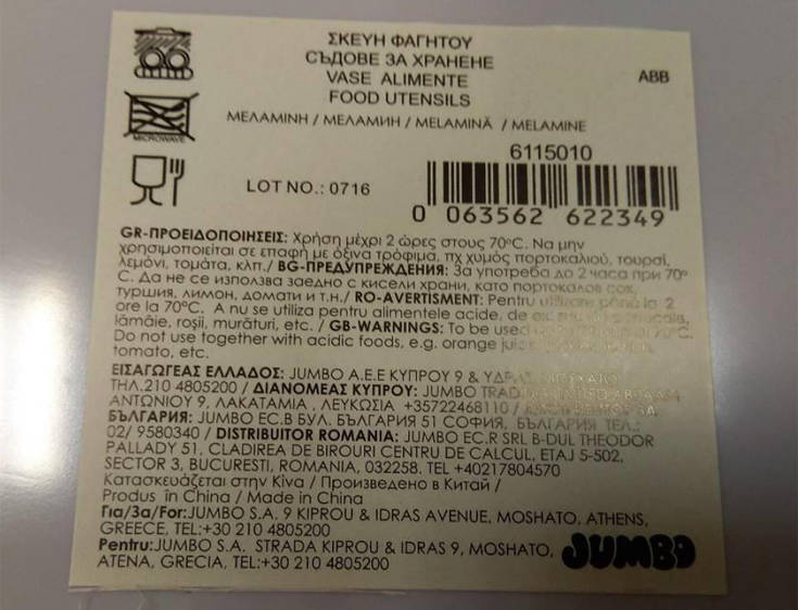 Συγκεκριμένα, διενεργήθηκε δειγματοληψία ρηχού πιάτου μελαμίνης με παράσταση Disney Frozen, με αριθμό παρτίδας Lot No 0716 και κωδικό είδους (Item No) 6115010, το οποίο κατασκευάζεται στην Κίνα, εισάγεται, διανέμεται και πωλείται από την επιχείρηση Jumbo ΑΕΕ.
