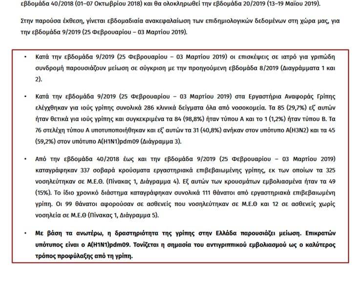 Εξ αυτών των κρουσμάτων εμβολιασμένα ήταν τα 49(15%). Το ίδιο χρονικό διάστημα καταγράφηκαν συνολικά 111 θάνατοι από εργαστηριακά επιβεβαιωμένη γρίπη. Οι 99 θάνατοι αφορούσαν σε ασθενείς που νοσηλεύτηκαν σε Μ.Ε.Θ και 12 σε ασθενείς χωρίς νοσηλεία σε Μ.Ε.Θ.».