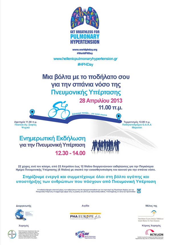 Με αφορμή τον εορτασμό της ημέρας, ο Σύλλογος Ασθενών «Πνευμονική Υπέρταση Ελλάδος» που αποτελεί το ελληνικό τμήμα του Ευρωπαϊκού Συλλόγου Ασθενών με Πνευμονική Υπέρταση (PHA EUROPE), διοργάνωσε σχετική Συνέντευξη Τύπου στην οποία υπογραμμίστηκε ότι η Πνευμονική Αρτηριακή Υπέρταση είναι μία νόσος στην οποία η διάγνωση καθυστερεί, εξελίσσεται ταχύτατα και έχει παράλληλα σοβαρό αντίκτυπο στους πάσχοντες και στις οικογένειές τους.