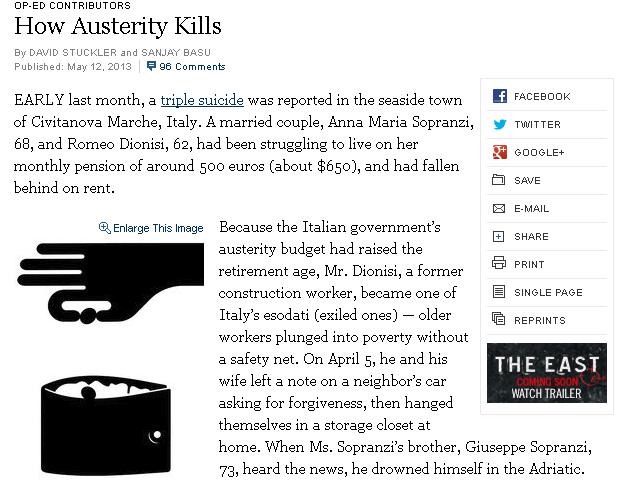 Οι αρθρογράφοι κάνουν ιδιαίτερη αναφορά στην αύξηση των θανάτων και των αυτοκτονιών στις χώρες που πλήττονται από τη λιτότητα, λόγω της ανεργίας και της κατάρρευσης των συστημάτων υγείας.