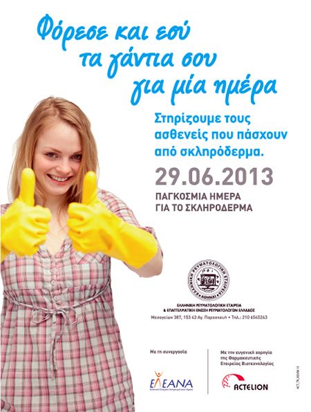 Με αφορμή την Παγκόσμια Ημέρα για το Σκληρόδερμα, στις 29 Ιουνίου 2013, η Ελληνική Ρευματολογική Εταιρεία & Επαγγελματική Ένωση Ρευματολόγων Ελλάδος πραγματοποιεί μία σειρά ενεργειών ενημέρωσης και ευαισθητοποίησης του κοινού για τη σπάνια νόσο του Σκληροδέρματος με κεντρικό μήνυμα «Φόρεσε και εσύ τα γάντια σου για μία μέρα» και δείξε στους ασθενείς με σκληρόδερμα ότι καταλαβαίνεις πως αισθάνονται».