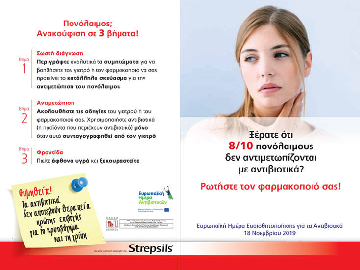 Για την ανακούφιση των ήπιων συμπτωμάτων του πονόλαιμου αρκεί είτε μια αντισηψία της στοματοφαρυγγικής κοιλότητας με κάποιο προϊόν που περιέχει αντιμικροβιακά / αντισηπτικά συστατικά όπως οι παστίλιες Strepsils ή αν πρόκειται για οξύ πονόλαιμο που συνήθως συνοδεύεται απο φλεγμονή, μπορεί να χορηγηθεί ένα αντιφλεγμονώδες που καταπραΰνει τον λαιμό σε μορφή παστίλιας ή spray όπως π.χ. Strepfen. Τα προϊόντα αυτά παρέχουν άμεση και αποτελεσματική ανακούφιση απο τα συμπτώματα του πονόλαιμου χωρίς να περιέχουν αντιβίωση.