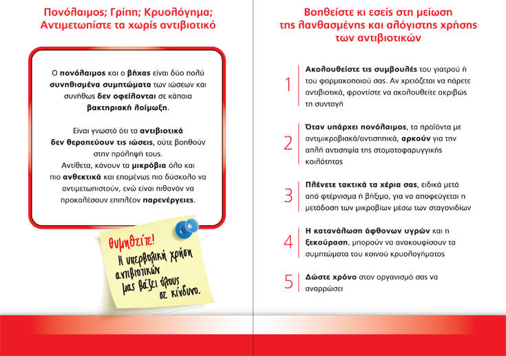 To παραπάνω γεγονός μπορεί να μειωθεί, εάν οι ασθενείς που απευθύνονται στην πρωτοβάθμια φροντίδα υγείας ενημερώνονται από τους γιατρούς και τους φαρμακοποιούς τους για τις εναλλακτικές επιλογές έναντι των αντιβιοτικών.